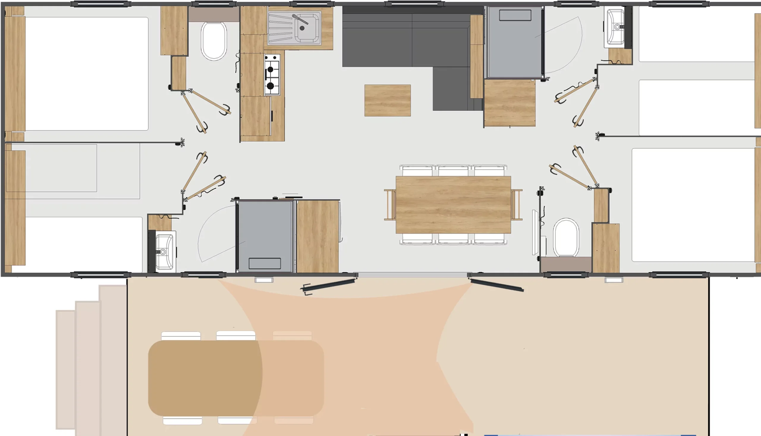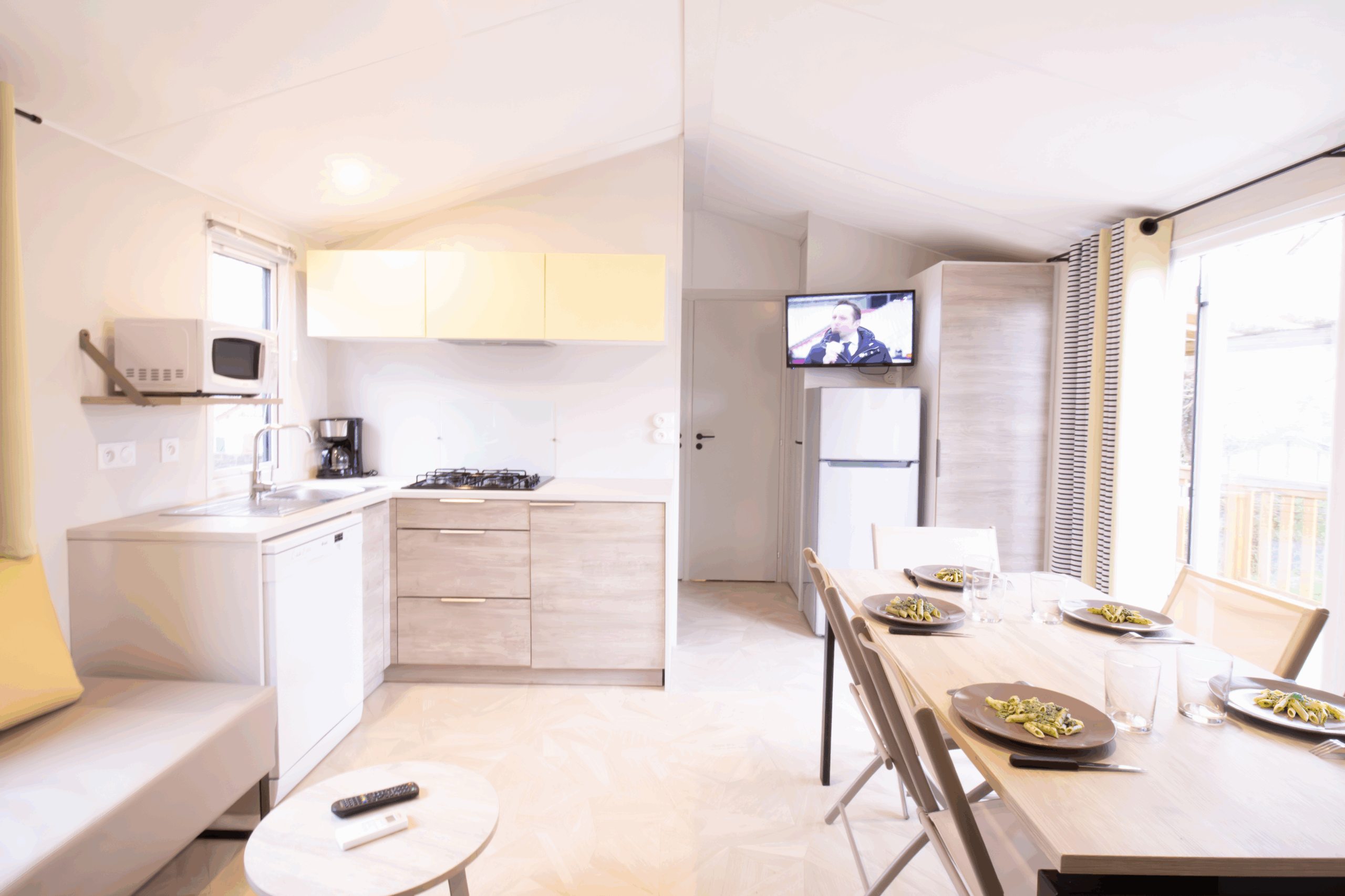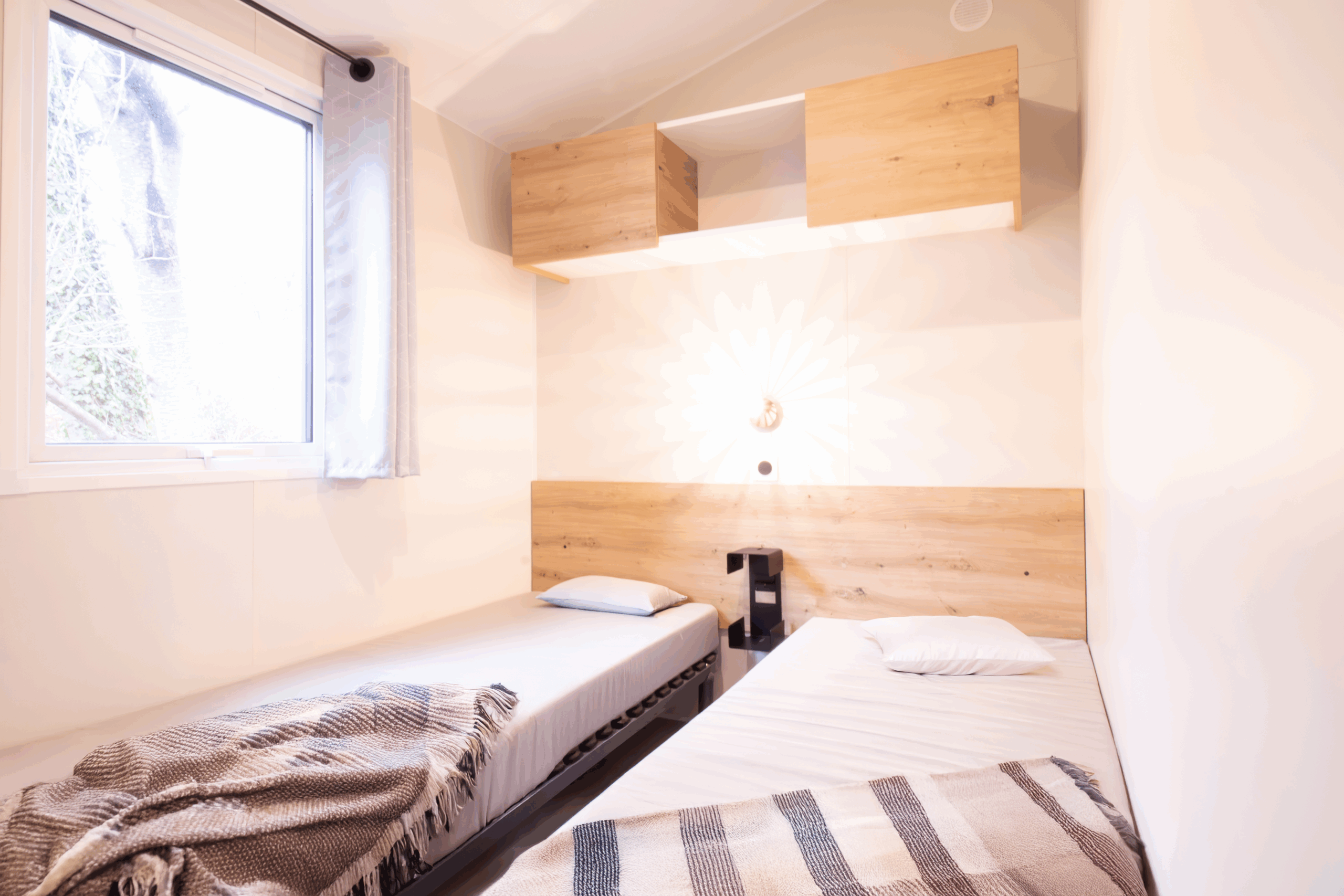 Idéal pour les grandes familles ou les séjours entre amis, le mobil-home Corail accueille jusqu’à 8 personnes dans un cadre spacieux et confortable. Avec ses 4 chambres, ses 2 salles de bain et ses 2 WC, chacun profite de son espace et de son intimité. Entièrement pensé pour votre confort, il est équipé d’une télévision, de la climatisation, d’un lave-vaisselle, d’une cafetière électrique, d’un micro-ondes, d’un sèche-cheveux et du wifi pour rester connecté même en vacances. Le Corail vous promet des vacances conviviales et confortables dans un hébergement spacieux, idéal pour partager de bons moments en tribu.