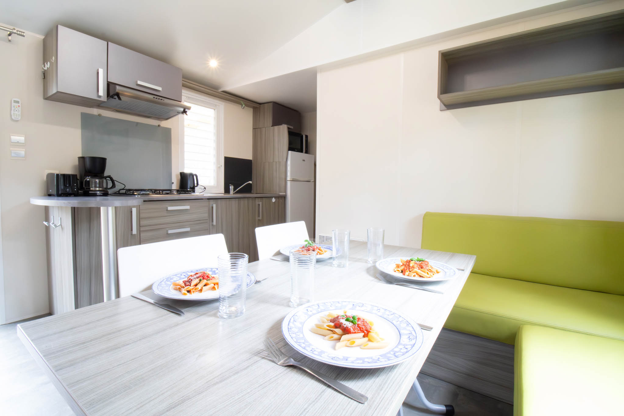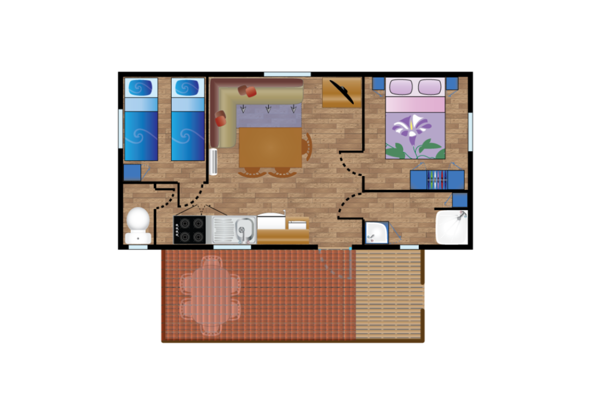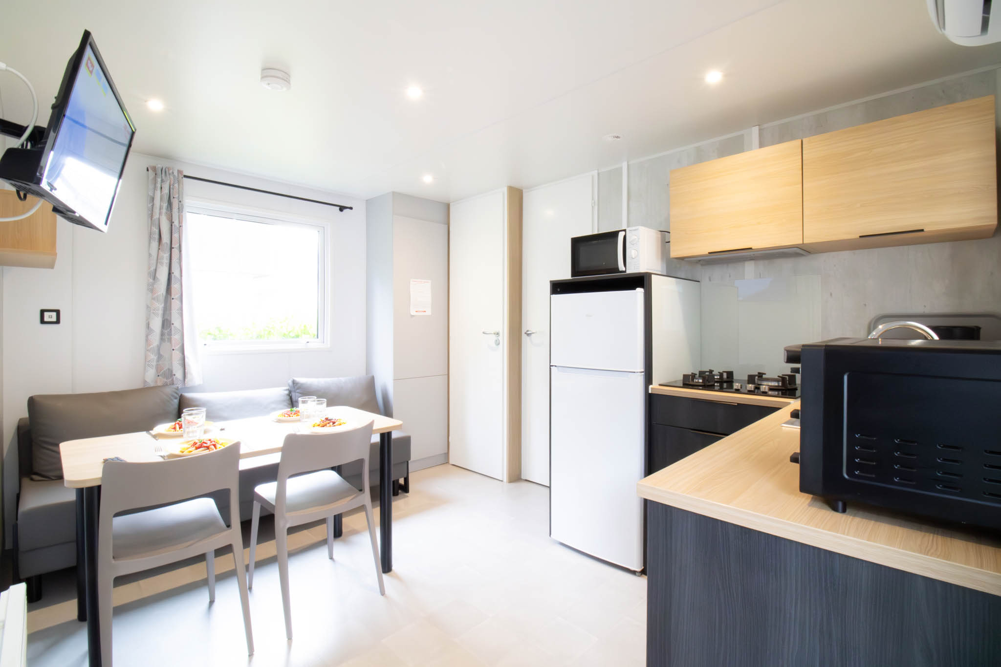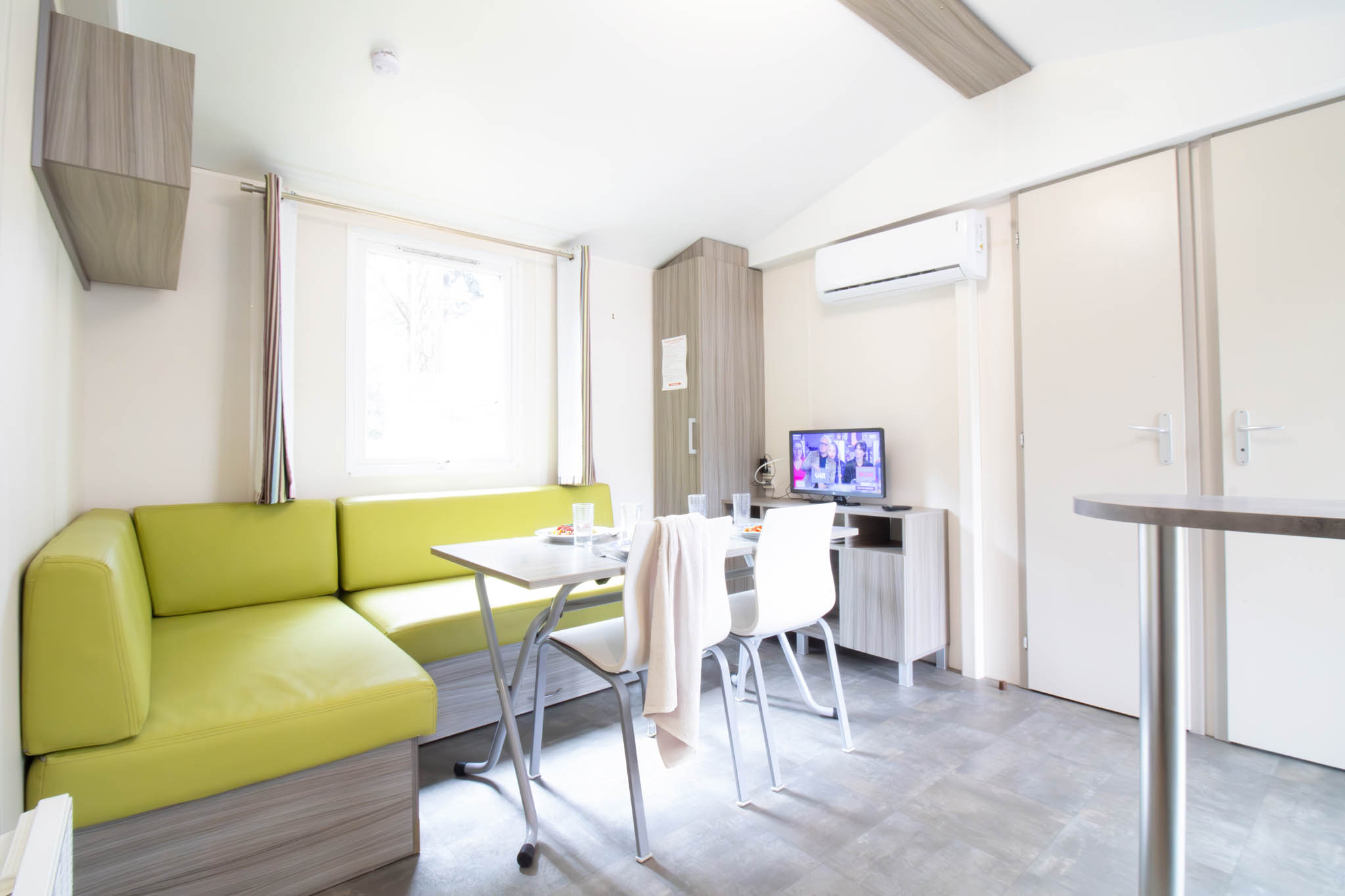 Le mobil-home NAUTILUS est idéal pour des vacances en famille ou entre amis, grâce à son confort moderne et ses équipements complets. Climatisé et parfaitement agencé, il peut accueillir jusqu’à 4 personnes. Il dispose d’une chambre avec lit double (140 cm) et d’une chambre avec deux lits simples (80 cm). Le canapé du séjour n’est pas convertible, garantissant un espace de vie agréable et spacieux. La cuisine est équipée d’un réfrigérateur, d’une télévision et de tout le nécessaire pour préparer vos repas. Pour profiter pleinement de l’extérieur, vous bénéficiez d’une terrasse semi-couverte entièrement fermée sur les côtés, idéale pour vos repas en plein air. Un hébergement confortable, moderne et pratique pour vos vacances à Saint Georges de Didonne.